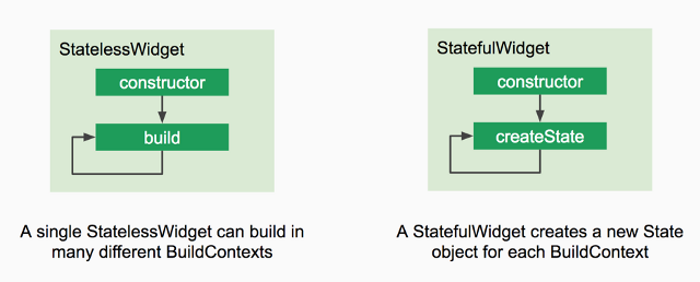Stateful widgets (statefulwidget): one (or more) property related to them, changing, can change the behavior, appearance or functionality of the widget. An app screen that changes based on content in an http response is a widget with status (just because the screen content varies based on the http response). Example: in case we need to request data from users and then update the same widget to validate or show an ok data entered correctly. To update the widget you need to use the setstate with the property updated so that the change is extended.